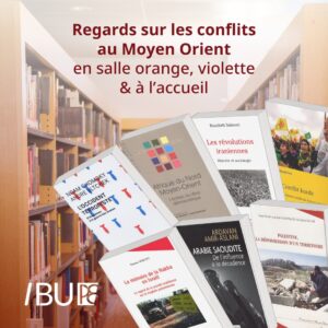 Dans le cadre des événements « Moments Palestine », la BU vous présente une installation nommée « La fatalité géographique », du 22 avril au 14 mai. En complément, nous vous proposons aussi une table thématique – « Regards sur les conflits au Moyen Orient » que vous pourrez consulter du 30 avril au 20 mai. Il s’agit d’une sélection de documents qui traitent des situations de guerre et de conflit dans la région durant les XXe et XXIe siècles.salles violette, orange & accueil - Du dimanche 14 avril au mardi 14 mai 2024 -